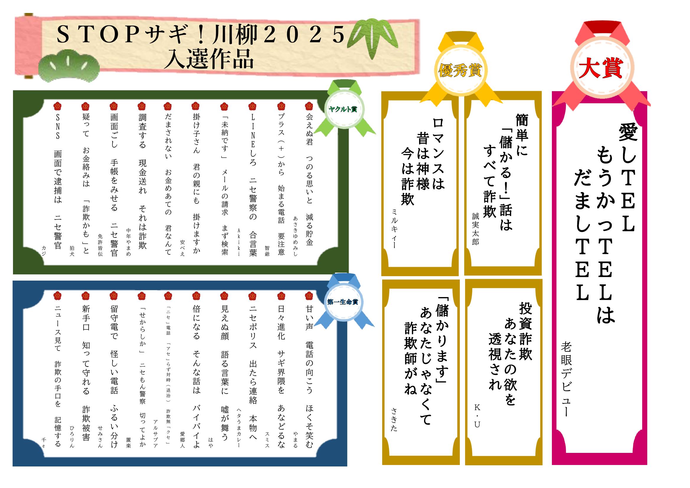 ニセ電話詐欺、SNS型投資・ロマンス詐欺、闇バイト等の被害防止に関する川柳