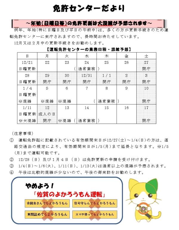 特に日曜日や平日午前中は、長時間お待たせする場合がありますので、可能な限り、12月中または2月中の免許更新にご協力をお願いします。
