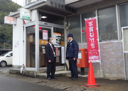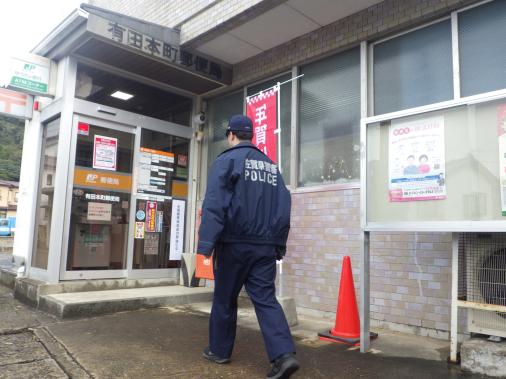 犯罪の未然防止と、ニセ電話詐欺被害の抑止のため、管内の金融機関を巡回し、職員の方々に警戒強化と来訪者に対する声かけの協力を依頼しています。