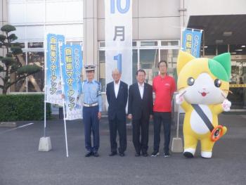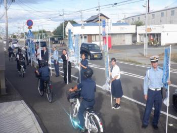 9月24日、吉野ヶ里町役場から寄贈して頂いた、自転車のマナーアップ及び自転車のヘルメット着用を呼び掛ける「のぼり旗」を活用して、三田川中学校の皆さんとともに交通安全街頭活動を実施しました。