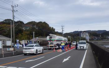 隣接する長崎県諫早警察署と合同で、県境の国道207号を通るドライバーの皆さんへ交通安全を呼び掛ける街頭キャンペーンを行いました。