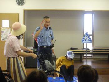 9月22日、西与賀町の今津上公民館で交通安全教室を開催し、自転車の交通ルールについて、寸劇で楽しく学んでもらいました。