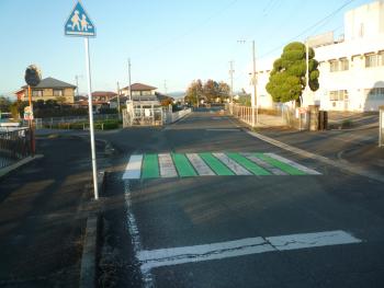 佐賀市立東与賀小学校の通学路にある横断歩道が、緑色にカラー舗装されました。