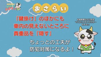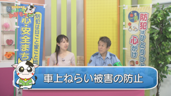 ケーブルテレビはっぴとすビジョンの「みんなで防犯おしえて!みまもぅ」の番組に出演し、車上ねらい被害防止を呼びかけました。